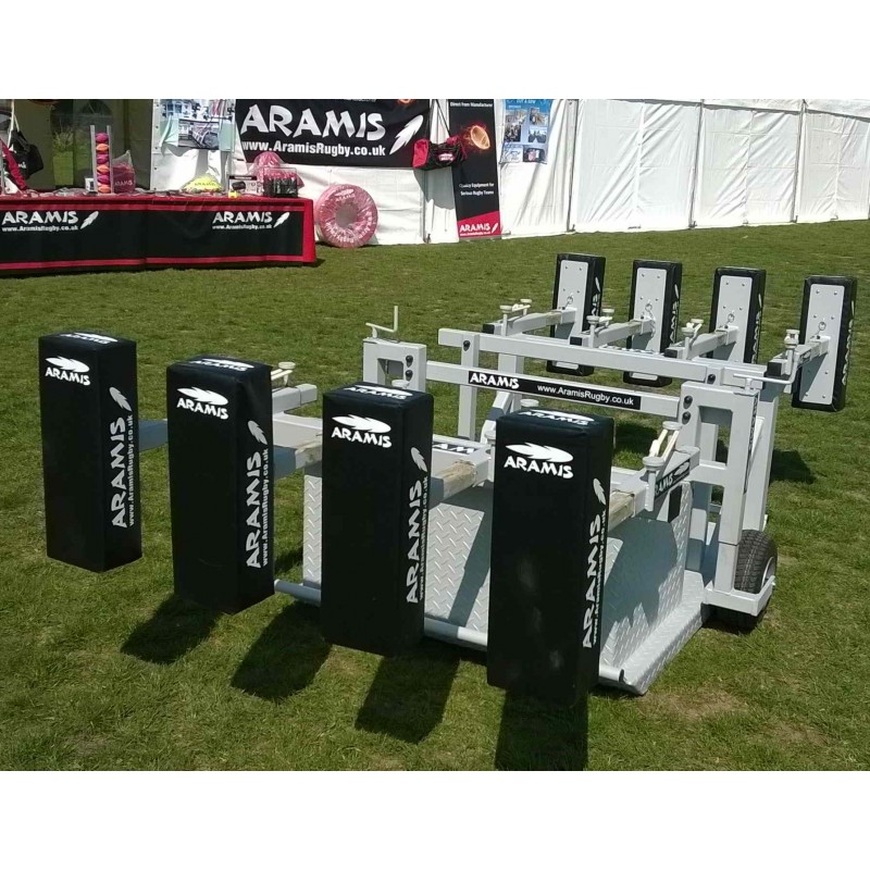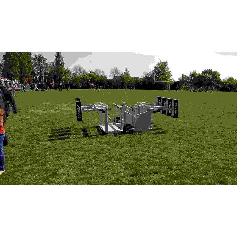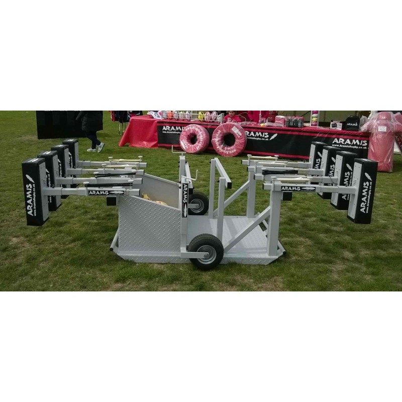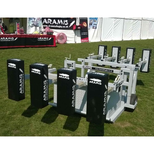 This is an ex-Display model of the double-ended CCSJR-STD Combo Chariot Reactive Kiwi Sled scrum machine which was exhibited by us at one of the Rugby Festivals recently. It has never been used and was only used for demonstrations on the day. This rugby scrum machine will be fully serviced and guaranteed against mechanical defects.